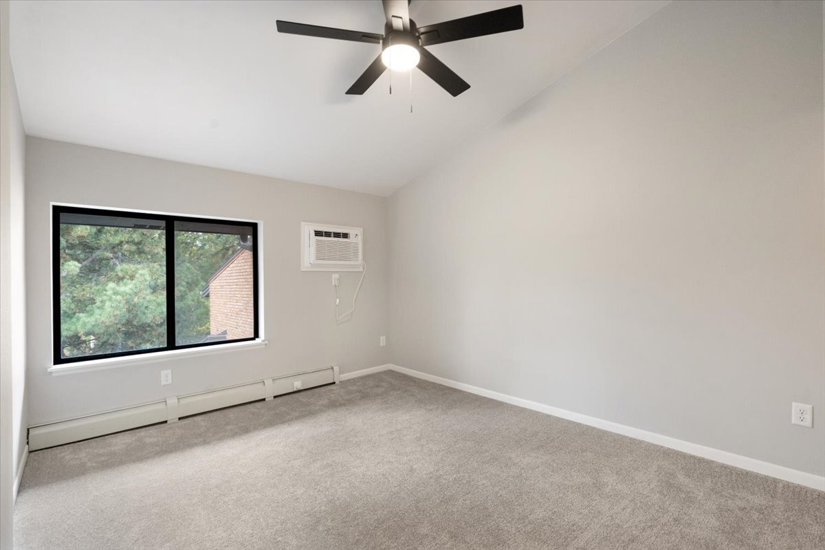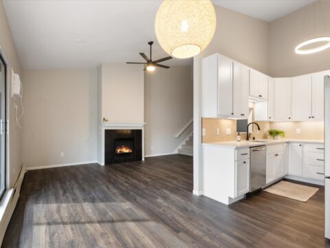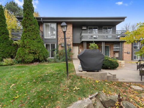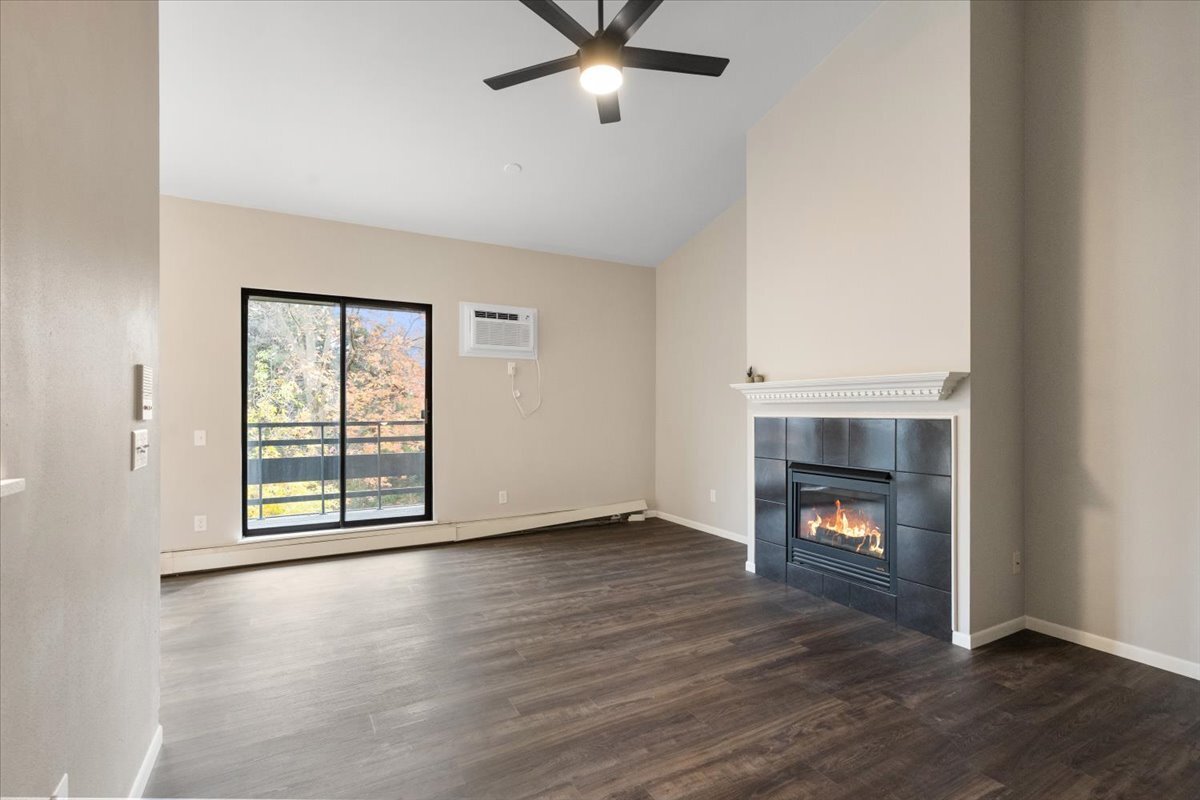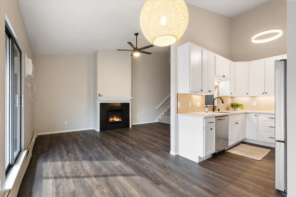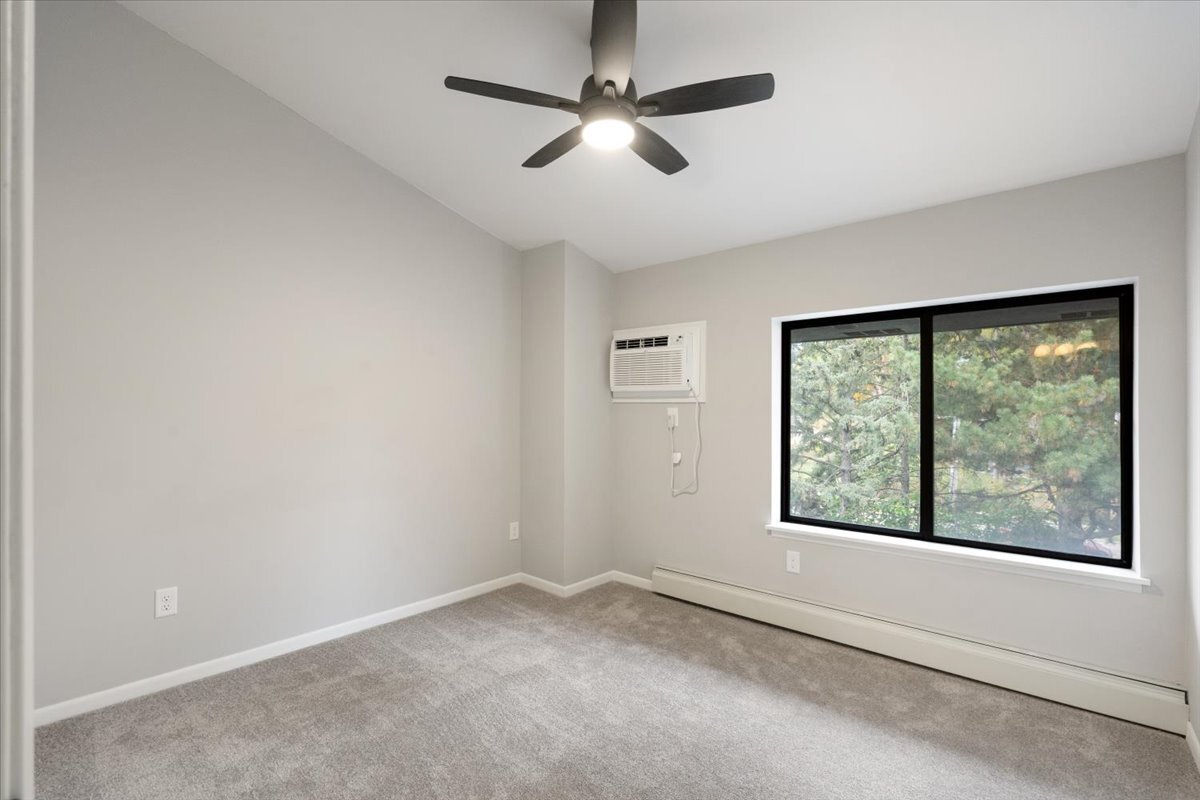 Lots to love in this renovated 2bd Middleton condo! The main living area (living, dining, kitchen) is extra spacious due to the tall vaulted ceiling. Two patio doors walkout to a large private balcony. Kitchen has been completely updated with new cabinets, quartz counters, tile backsplash, SS appliances, and inviting under-cabinet lighting. New LVP throughout the main living area, and new carpet upstairs. Both bathrooms completely renovated, including a Fibo panel shower. All 3 wall AC units are brand new. All doors updated to a modern style. Fresh paint throughout. Plus in-unit laundry with brand new washer & dryer! Move in and enjoy! Heat and water included in condo fee. Measurements are approx.