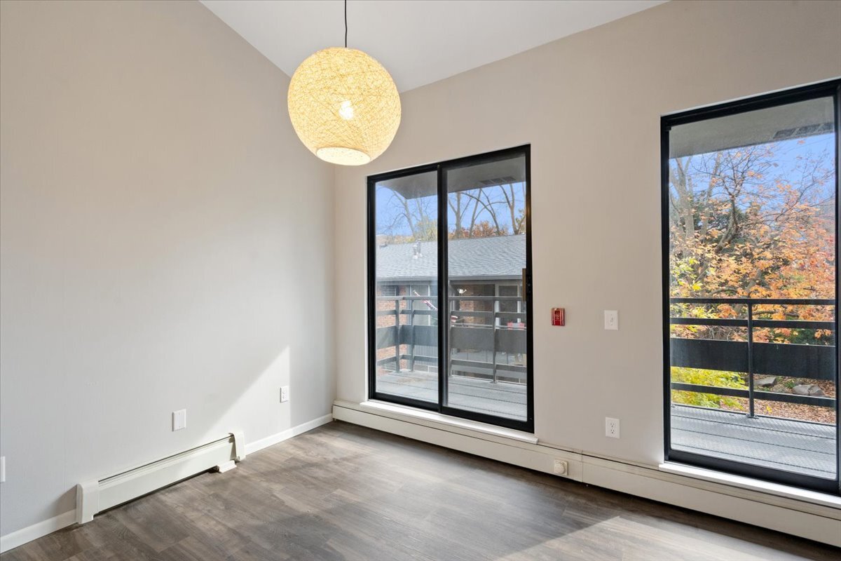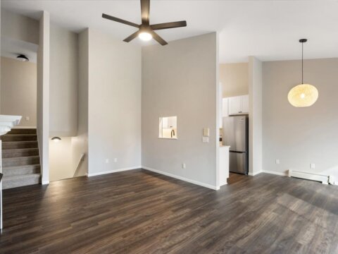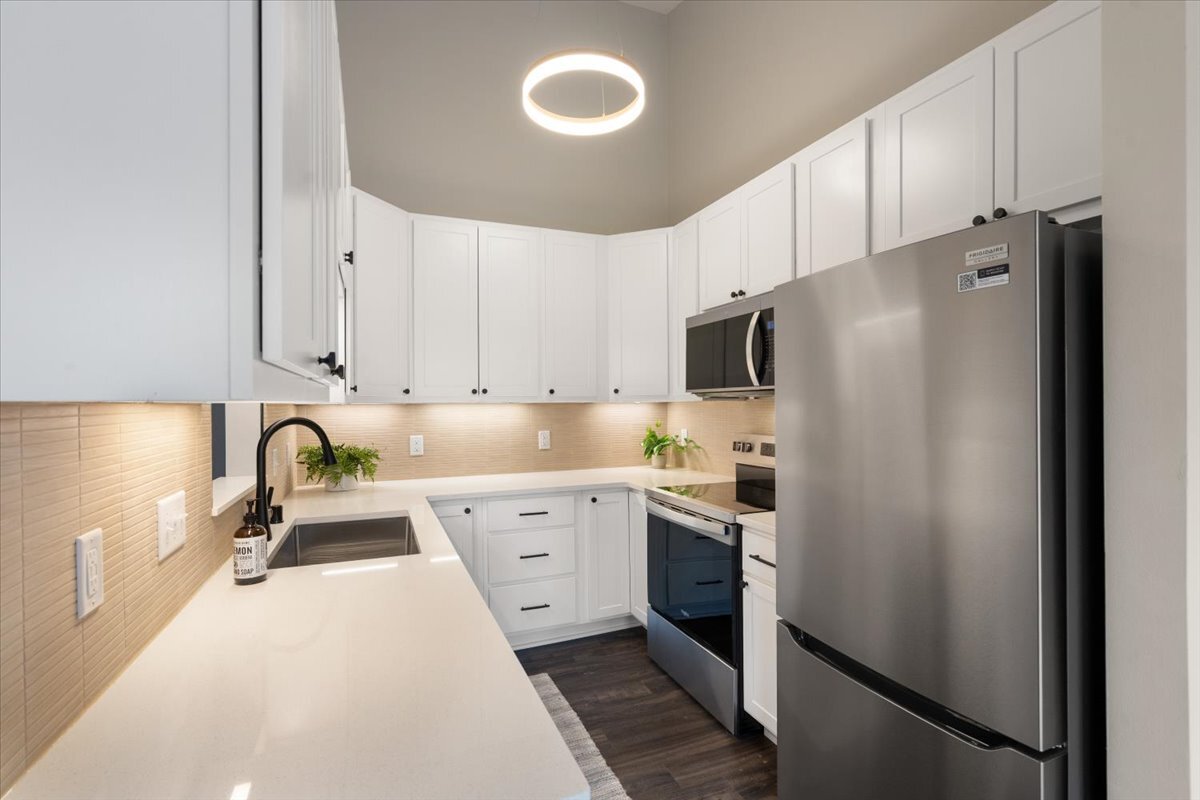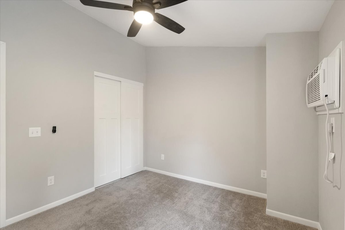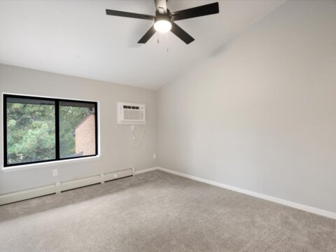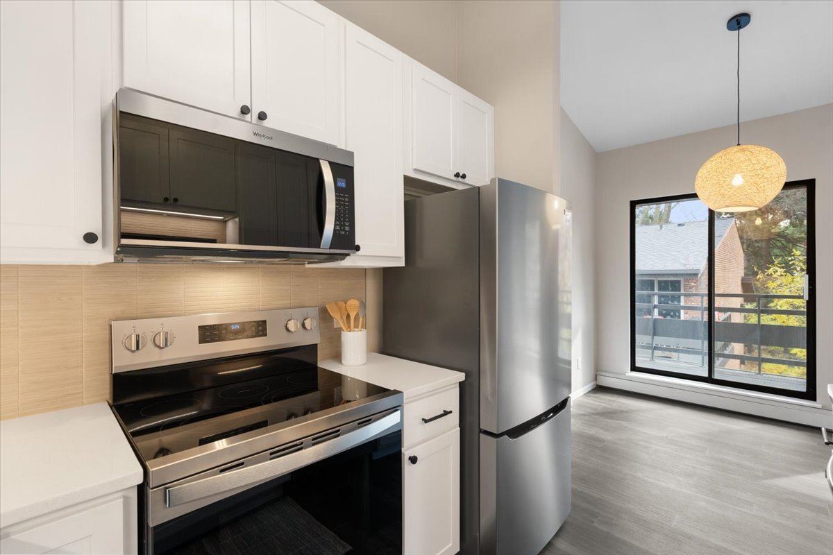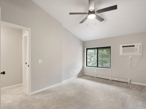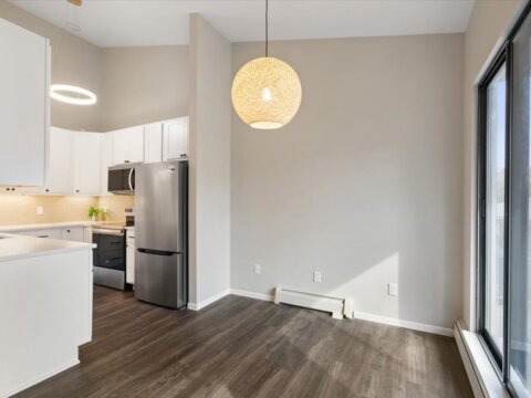 Lots to love in this renovated 2bd Middleton condo! The main living area (living, dining, kitchen) is extra spacious due to the tall vaulted ceiling. Two patio doors walkout to a large private balcony. Kitchen has been completely updated with new cabinets, quartz counters, tile backsplash, SS appliances, and inviting under-cabinet lighting. New LVP throughout the main living area, and new carpet upstairs. Both bathrooms completely renovated, including a Fibo panel shower. All 3 wall AC units are brand new. All doors updated to a modern style. Fresh paint throughout. Plus in-unit laundry with brand new washer & dryer! Move in and enjoy! Heat and water included in condo fee. Measurements are approx.